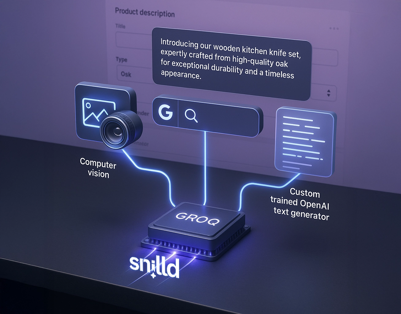 Snilld har udviklet en AI-drevet produkttekstgenerator, der klarer arbejdet på få sekunder. Du uploader et billede af dit produkt og vælger en kategori – resten sker automatisk: